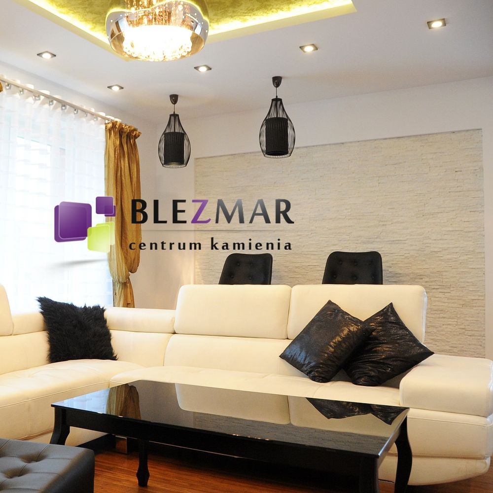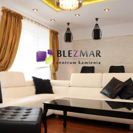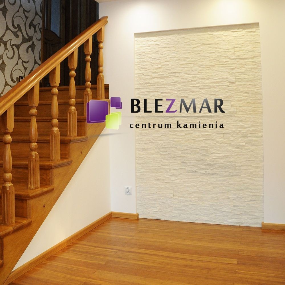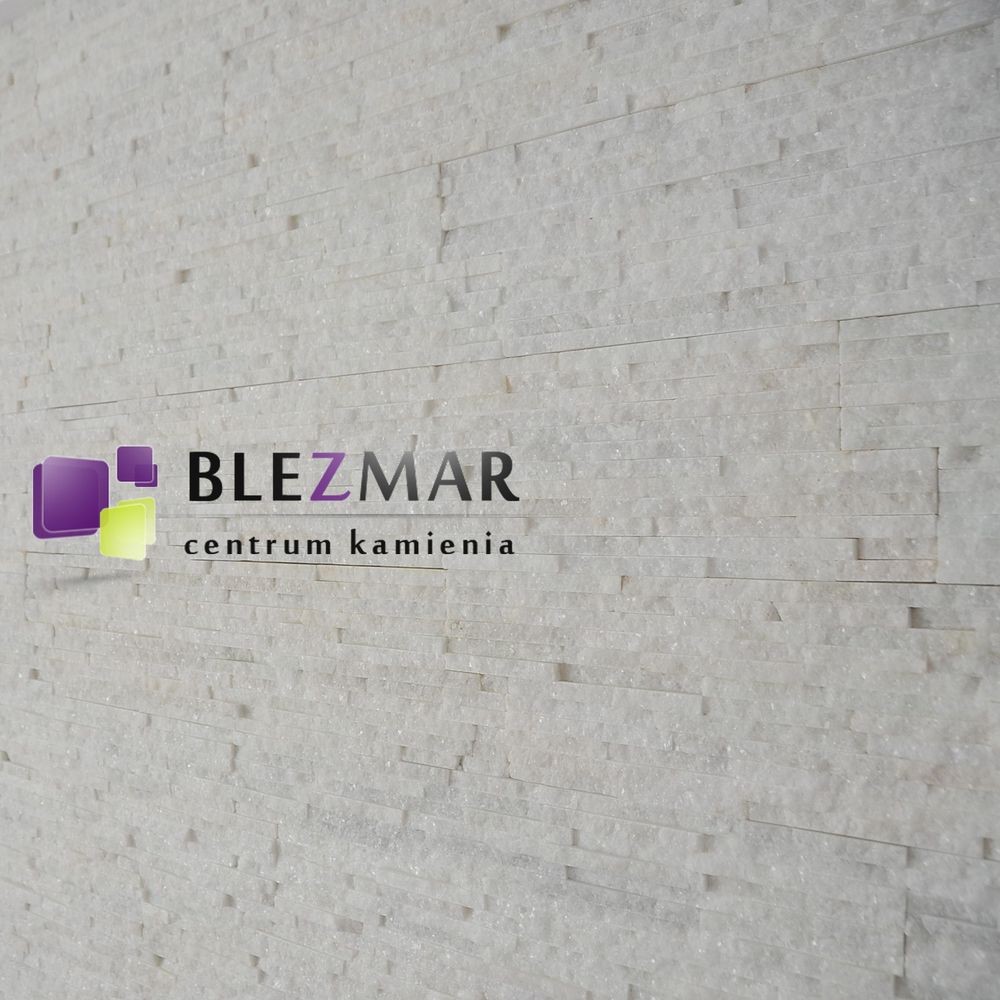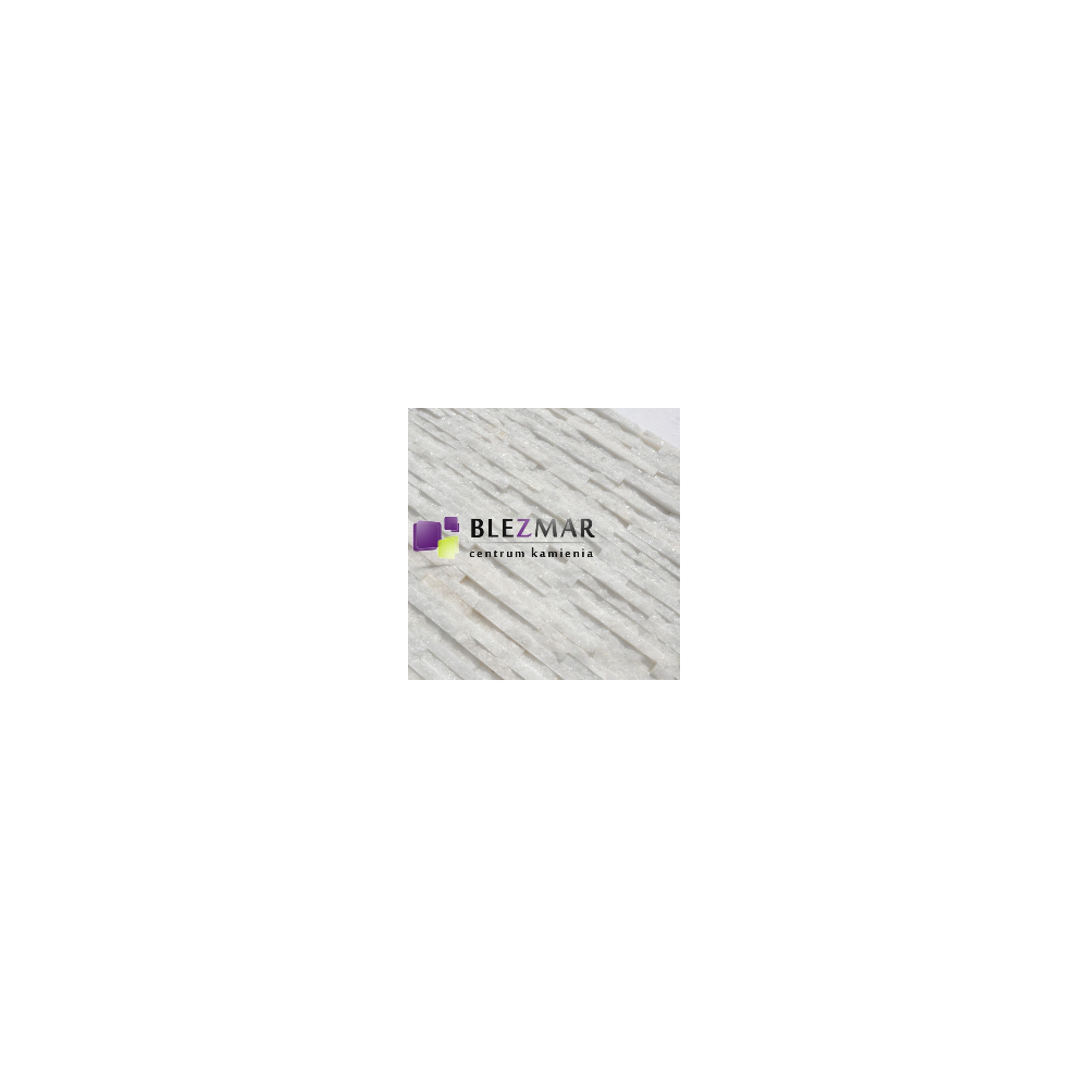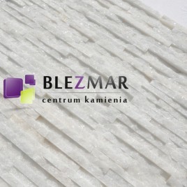 Śnieżnobiały kamień dekoracyjny mieniący się do słońca formowany w wąskie, podłużne paski, doskonale sprawdzi się do aranżacji ścian wewnętrznych.