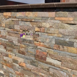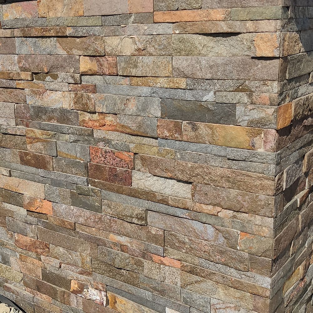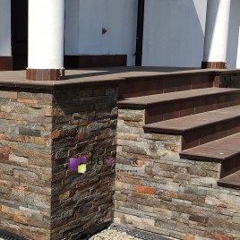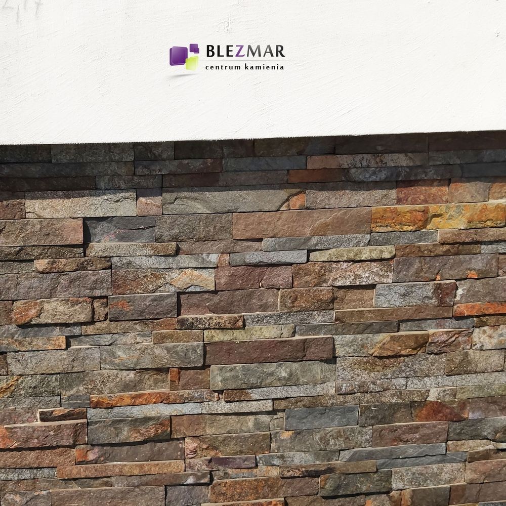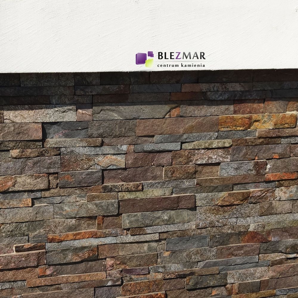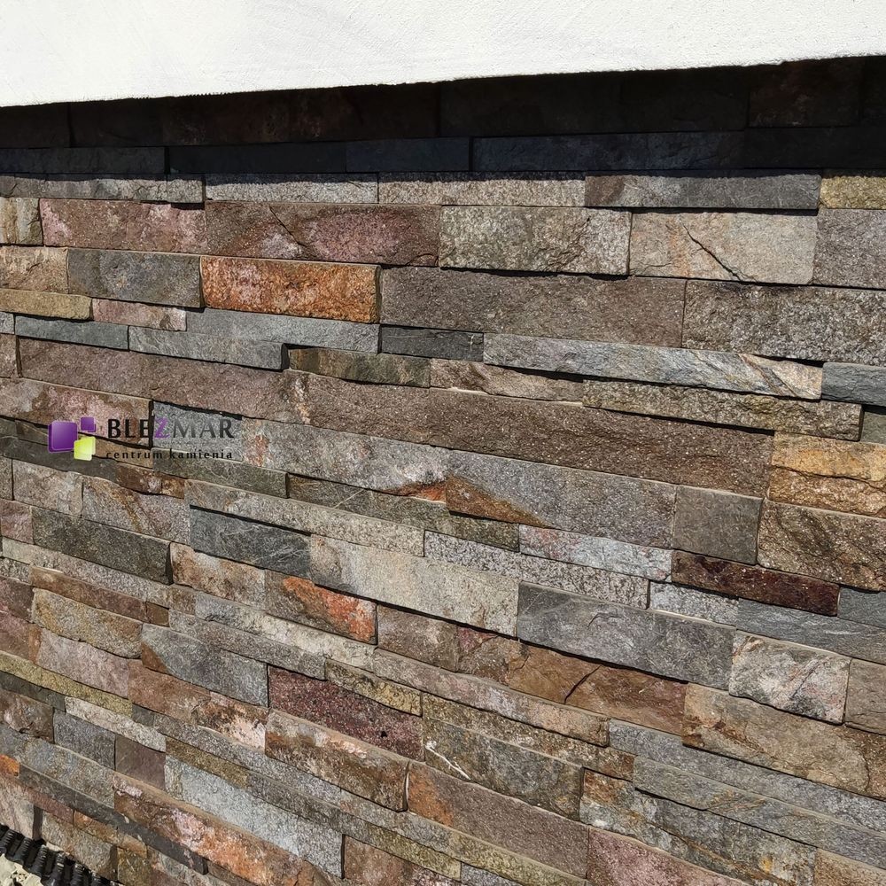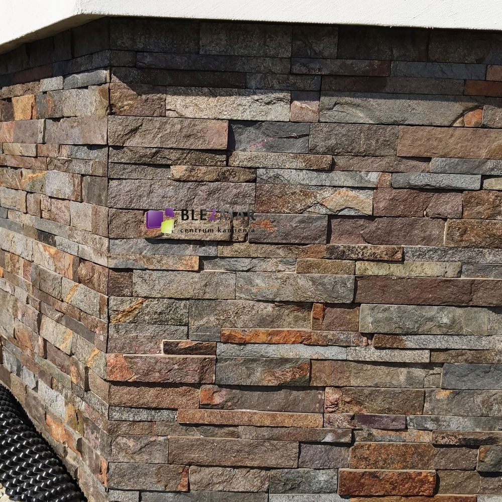 Brązowo-szary-kamień elewacyjny, mieniący się do słońca.