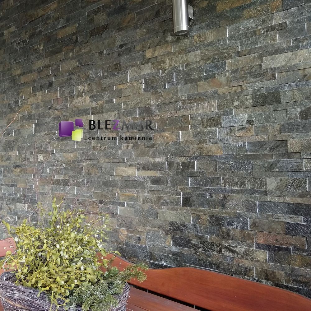 Panel z kamienia naturalnego o szaro-oliwkowym kolorze w metalicznym wykończeniu.