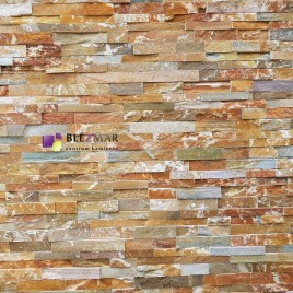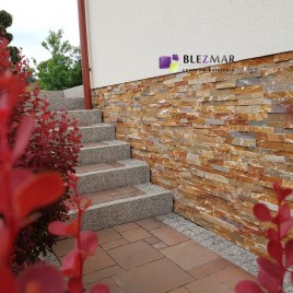 Panel PE40 Modern to wyrafinowany element dekoracyjny, skonstruowany z delikatnie ułożonych, kamiennych pasków, które emanują złotym blaskiem i charakteryzują się unikalną fakturą. Dzięki naturalnej, strukturalnej powierzchni, panele te harmonijnie wkomponowują się zarówno w nowoczesne, jak i rustykalne wnętrza. Ich imponująca odporność na warunki atmosferyczne, twardość oraz niezwykła wytrzymałość na ścieranie i uszkodzenia mechaniczne sprawiają, że doskonale sprawdzają się także na zewnątrz - na tarasach, zewnętrznych schodach, ogrodzeniach czy elewacjach. W ten sposób, Panel PE40 Modern nie tylko nadaje wnętrzom niepowtarzalny charakter, ale również stanowi eleganckie i trwałe rozwiązanie także dla przestrzeni zewnętrznych.